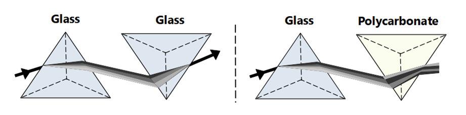 Notice the Beam passes then is shifted, This has an effect on light transmission and the way an officer sees traffic and at night lights via the Windshield.