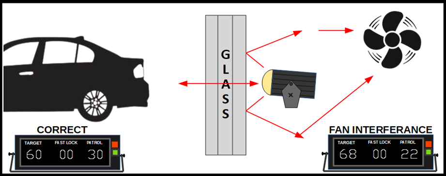 Radar Antennas in fact use glass and plastics as part of the Antenna design. These designs are tested for Type Acceptance by the F.C.C. in the United States. Placing Curved Glass, with several laminations close to the antenna can have an effect on the way the Antenna functions and the Radar presents the speeds. Type acceptance often looks at beam width and many agencies have a preference of an 11 to 13 degree Beamwidth for optimal use in traffic. Since the antenna effects the Beamwidth, the recomended remedy at this time is to mount the Antennas to the outside of the glass.