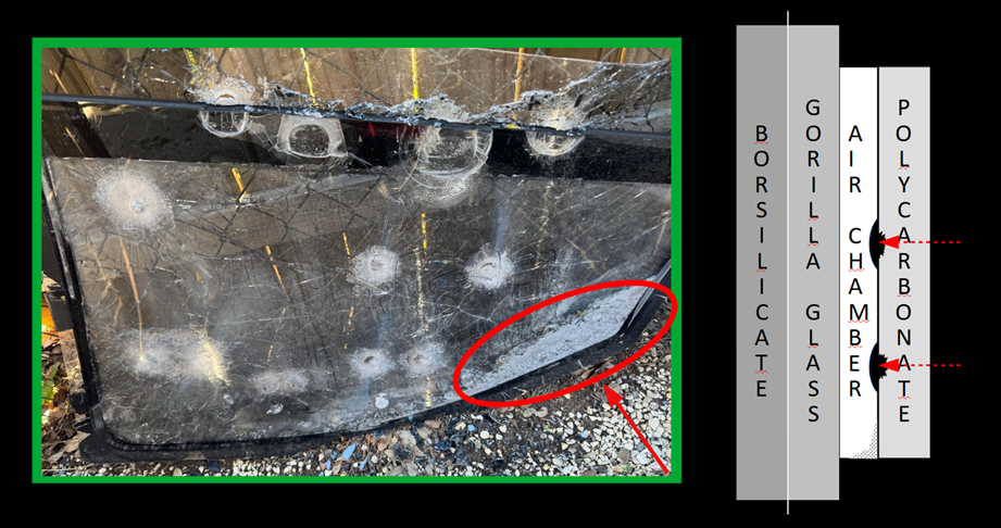 When the rounds pass it creates spall and ISBI provides an air chamber to catch the spall and you will notice the glass flipped upside down and the collection of particles of glass and poly that was captured by the few rounds. The spall that is in the red circle is trapped in the air chamber and not in the cabin.